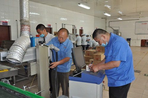 在包裝生產(chǎn)線前,檢查組成員檢查了消防通道、滅火器、線路管網(wǎng)和生產(chǎn)設(shè)備,對設(shè)備中存在破損處也一一指出,要求整改。